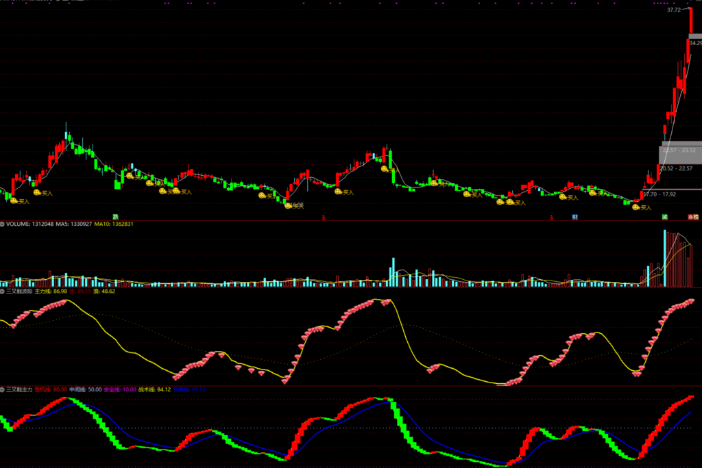 主力副图:显示主力操作区间,散户只需跟随主力进场出场即可。